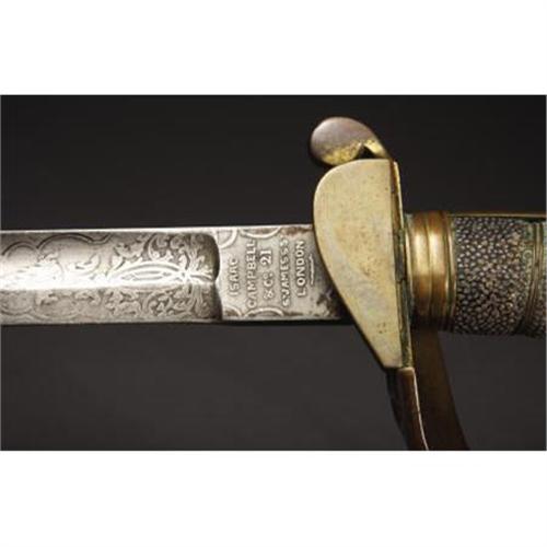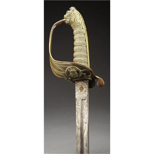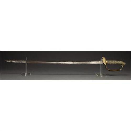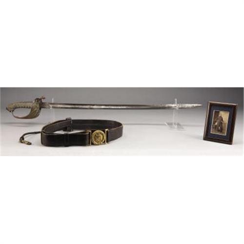<B>ULTRA RARE, ENGLISH MADE, TWO PIECE INTERLOCKING CONFEDERATE NAVY WAIST BELT PLATE ON THE ORIGINAL LEATHER THAT BELONGED TO LIEUTENANT JOHN LOW OF THE C.S.S. </B></I><B><I>ALABAMA</B></I></B></I><B>.</B></I> Accompanied by his English made, Isaac Campbell & CO. naval officer’s sword and <I>carte de visite</B></I>. Also included is the hand executed coat of arms and family tree detailing Low’s lineage.<BR> <BR>The 80mm X 54mm cast brass plate retains 98% of the original gilt on the face w/deep untouched patina on the back which was never gilded, exquisite workmanship. The tongue disc depicts two crossed cannons behind a fouled anchor. This Confederate naval motif surmounts the letters “C. N.”, the whole emerging in high relief from a stippled background. The design of the plate’s wreath is borrowed from the Great Seal of the Confederate States of America being composed primarily of tobacco and cotton plants and pays tribute to the South’s economic backbone. Both tongue and wreath are benchmarked with the number “3”. The plate is mounted on its original leather belt w/brass adjusting loop. An unusual feature of the belt is that instead of having a conventional flat sword suspension strap it utilizes a hanging cord composed of braided leather that terminates in a gilt brass snap swivel. A gilt brass suspension hook is also attached at the belt. The sword has a 27 ¼” blade etched with floral/scroll motifs, the English seal with motto on the obverse, and crown surmounting an anchor with floral/scroll motifs on the reverse. The reverse ricasso is brightly etched “Isaac/Campbell/7 Co. 21/St. James St.’London”, with the obverse ricasso incorporating a small inlaid brass disc marked “Proved”. All etching highlighted with hand engraved details. The firm of Isaac Campbell & Co. was formed in 1861 by Saul Isaac and his nephew Benjamin Hart of new York. They produced all types of military equipment during the Civil War which they supplied exclusively to the Confederacy. Standard English naval officer's sword of the period with the exception of the Isaac Campbell mark, which identifies this as a uniquely Confederate weapon. Brass hilt with lion head pommel, crown over anchor cast on the face of the cup like guard. The reverse counterguard folds down. Fishskin grip with double strand brass wire wrap. It is very likely that this is the sword that was originally furnished with the belt. The full standing <I>carte de visite </B></I>shows Low in his double breasted Confederate naval officer’s frock coat holding gloves in his hand and wearing an unidentified badge on his right breast. The image is backmarked by “The London School of Photography with various addresses. The family tree is beautifully hand painted on heavy paper, approximately 14” X 14 ½” (it has been archivally framed and mounted. Watercolor representation of the Low family coat of arms at upper left, the balance an exquisitely executed depiction of the Low family tree.<BR><BR>John Low (1836 - 1906) is variously reported as having been born in either England or Scotland. A sailor by trade, he was living in Savannah at the outbreak of the war and answered the South’s call to arms by enlisting in a Georgia cavalry regiment. Given his training, however, low was soon recruited for the fledgling Confederate navy and, on November 5, 1861, was commissioned a Master. During the course of the war Low would primarily serve aboard the CSS <I>Florida</B></I>, the CSS <I>Alabama</B></I> and the CSS <I>Tuscaloosa</B></I>. Low’s seamanship, having impresses Raphael Semmes of the <I>Alabama</B></I>, resulted in the young Brit turned Georgian being given command of the <I>Tuscaloosa</B></I> on June 21, 1863. No doubt this belt rig bore witness the much of the history of the short lived Confederate Navy.<BR><BR>A remarkably rare Confederate belt and buckle w/the added interest of being associated with the Confederacy’s most feared and notorious commerce raider, the CSS <I>Alabama</B></I>. <BR><BR><B>Condition</B></I>: The plate is in pristine untouched condition. The belt is also in wonderful condition with only very slight crazing to the finish and some wear on the edges. All stitching is tight and sound. The sword’s brass hilt retains traces of the original gilt in recessed areas, the balance a very nice dark untouched patina. Most of the blade is a dark gray with some scattered light pitting and a few small patches a bit heavier. Etching overall very good with the Isaac Campbell panel bright and crisp. The sword is completely untouched. The<I> carte de visite </B></I>is pristine. The coat of arms/family tree are perfect.<BR><BR><B>Provenance:</B></I> <I>The Tharpe Collection of American Military History</B></I><BR><BR><B>Exhibited:</B></I> <I>The Liberty Heritage Society Museum</B></I><BR><BR><b>Shipping:</b> Requires 3rd Party Shipping (<a target="_blank" href="http://www.heritageauctions.com/common/shipping.php">view shipping information</a>)