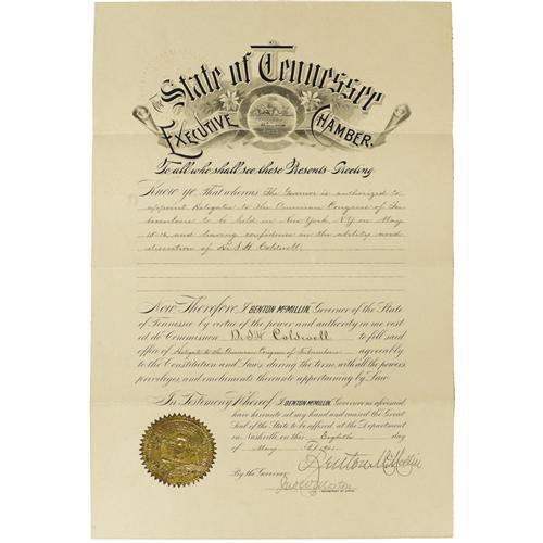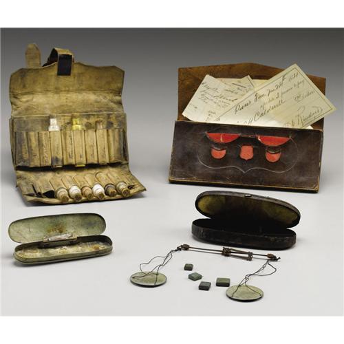 <B>Confederate Surgeon Major Samuel Houston Caldwell's Medical Diploma and Battlefield Medical Items.</B></I> This 1858 medical diploma from the Jefferson Medical College of Philadelphia awarded to Samuel Houston Caldwell measures 24¾” x 21½” and is printed in elaborate Latin script. With Caldwell's name written in calligraphy and the degree specified in Latin, this is a striking medical diploma of the doctor who would become the battlefield surgeon to Confederate cavalryman General Nathan Bedford Forrest. <BR><BR>Signed by the officers of the college, the ink on the diploma is still very dark, the parchment sturdy with some light foxing toward the middle of the diploma. The light blue silk ribbon with the attached seal of the college is still affixed to the bottom of the diploma making this an attractive presentation piece of a historical figure from the Civil War. Confederate Surgeon Caldwell took his medical office with him to the battlefield as best he could. Riding with General Forrest's command necessitated an abbreviated assortment of medical accouterments. These battlefield scales still have their weighing pans, string and four assorted square weights intact along with its 5” tin container. <BR><BR>An amazing leather cased field drug kit, fitted for twenty vials of medicines for use on the battlefield, has been remarkably preserved with nine of its original glass vials, some containing powders of different colors. Each sleeve for the vials is named for the particular medicine such as aloe, opium or antimony. Measuring 6” when closed but opening to 10” when the medicines are exposed, the leather strap of the kit has been repaired, but otherwise the kit is in excellent overall condition. <BR><BR>Taken to war with Dr. Caldwell was this tin eyeglass case and gutta percha mirror. Measuring 4¾” across, the tin case is accompanied by this 3½” x 6” gutta percha oval mirror which is missing its base into which the slotted end of the mirror would slide. <BR><BR>Dr. Caldwell remained active after the war in political circles and attended most of the meetings of the United Confederate Veterans. Governor Benton McMillin appointed Dr. Caldwell to the American Congress of Tuberculosis in 1901 as evidenced by this certificate awarded to Dr. Caldwell. Measuring 11½” x 18”, the certificate bears three fold marks, a gold Tennessee state seal, and is signed by Governor McMillin. <BR><BR>Also included with this archive is Dr. Caldwell's personal wallet containing receipts for monies owed to him in his practice at Paris, Tennessee. Dated from 1874 and later, they fit into the four inner compartments of the 8” wide wallet with its intact leather strap. These items are historical reminders of the Confederate Surgeon to General Forrest who survived the war and returned to private practice in Tennessee.<BR><BR><b>Shipping:</b> Miscellaneous Collectibles, Smal (<a target="_blank" href="http://www.heritageauctions.com/common/shipping.php">view shipping information</a>)