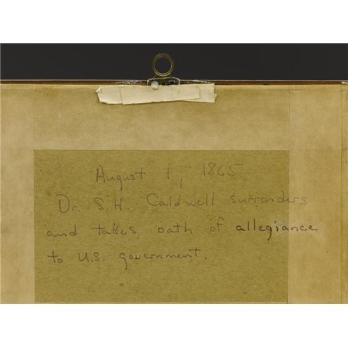 <B>Confederate Surgeon Samuel Houston Caldwell's Oath of Allegiance to the United States</B></I> at the Close of the War. Caldwell served with General Nathan Bedford Forrest's command until the end of the Civil War. He made his way to Mississippi on his return to his native Paris, Tennessee and met with Colonel William E. Travis, formerly of the 5th Tennessee Infantry. Before returning to Tennessee he signed this oath of allegiance to the United States in Mississippi. Numbered 592, this pre-printed document is on lined blue paper and specifically mentions the emancipation of slaves. Caldwell took his slave, Joe Caldwell, with him and his family were significant slaveholders in Tennessee. The document is in excellent condition with a slight tear at the top.<BR><BR><b>Shipping:</b> Miscellaneous Collectibles, Smal (<a target="_blank" href="http://www.heritageauctions.com/common/shipping.php">view shipping information</a>)