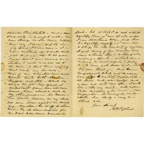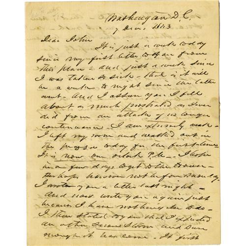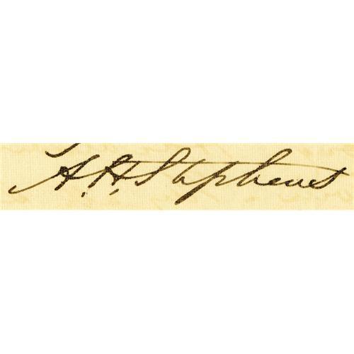 <B>Alexander H. Stephens, Confederate Vice President, Autograph Letter Signed,</B></I> December 7, 1843. Alexander Hamilton Stephens, Vice President of the Confederate States of America from 1861-1865, was born in Crawfordsville, Georgia in 1812. He graduated first in his class from Franklin College, later the University of Georgia and became an attorney. He was elected to Congress in 1842 and started his noted political career in the lower house where he served until 1858. With the Civil War brewing, Stephens sought to have Georgia remain within the Union. Voting against secession at the state convention, he nevertheless supported his state and the Confederacy serving in the first Confederate Congress where he was named Vice President of the Confederacy. <BR><BR>A strict states' rights advocate, he opposed President Jefferson Davis' infringement on individual rights and promoted a vigorous prisoner exchange program. In February 1865 he was the Confederate States' representative at the Hampton Roads Conference where he attempted to negotiate peace with President Lincoln on the steamer <I>River Queen.</B></I> <BR><BR>At the end of the war he was arrested at his home in Crawfordsville and imprisoned for five months. The voters of Georgia returned him to Congress until he resigned in 1882 to be elected governor. He served only a few weeks, dying in March 1883. <BR><BR>This ALS is dated December 7, 1843 and was written at Washington while Stephens served in Congress. It bears a red 'free frank' stamp and is postmarked at Washington as well. Measuring 8" x 10" it is three pages in length and is in fine condition. Addressed to John L. Bird at Crawfordsville, Georgia, the letter criticizes the content of many of the congressional speeches Stephens had heard while in Washington. Telling Bird that "he never speaks unless he has something to say", Stephens notes he himself had not spoken as yet. The letter comes with a hardbound gray slipcase which is engraved with gold lettering.<BR><BR><b>Shipping:</b> Small Collectibles (<a target="_blank" href="http://www.heritageauctions.com/common/shipping.php">view shipping information</a>)