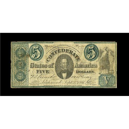 <B>CT-33/250 Counterfeit $5 1861.</B></I> This lithograph counterfeit has plate letter J, printed signatures, and hand-written serial numbers. Listed as a Rarity 6 in the Tremmel reference. <B>Fine.</B></I>