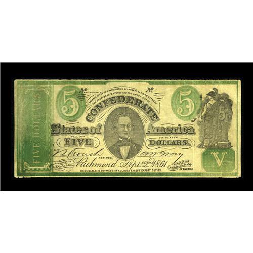 <B>CT-33/250B Counterfeit $5 1861.</B></I> This woodcut counterfeit is missing its plate letter J on the left-side of the note. Also, the signatures are printed and the serial numbers are missing. This note is listed as a Rarity 6 in the Tremmel reference. <B>Fine-Very Fine.</B></I><BR><I>From The George P. Hammerly Collection</B></I><BR><BR><b>Shipping:</b> Coin/Currency (<a target="_blank" href="http://www.heritageauctions.com/common/shipping.php">view shipping information</a>)