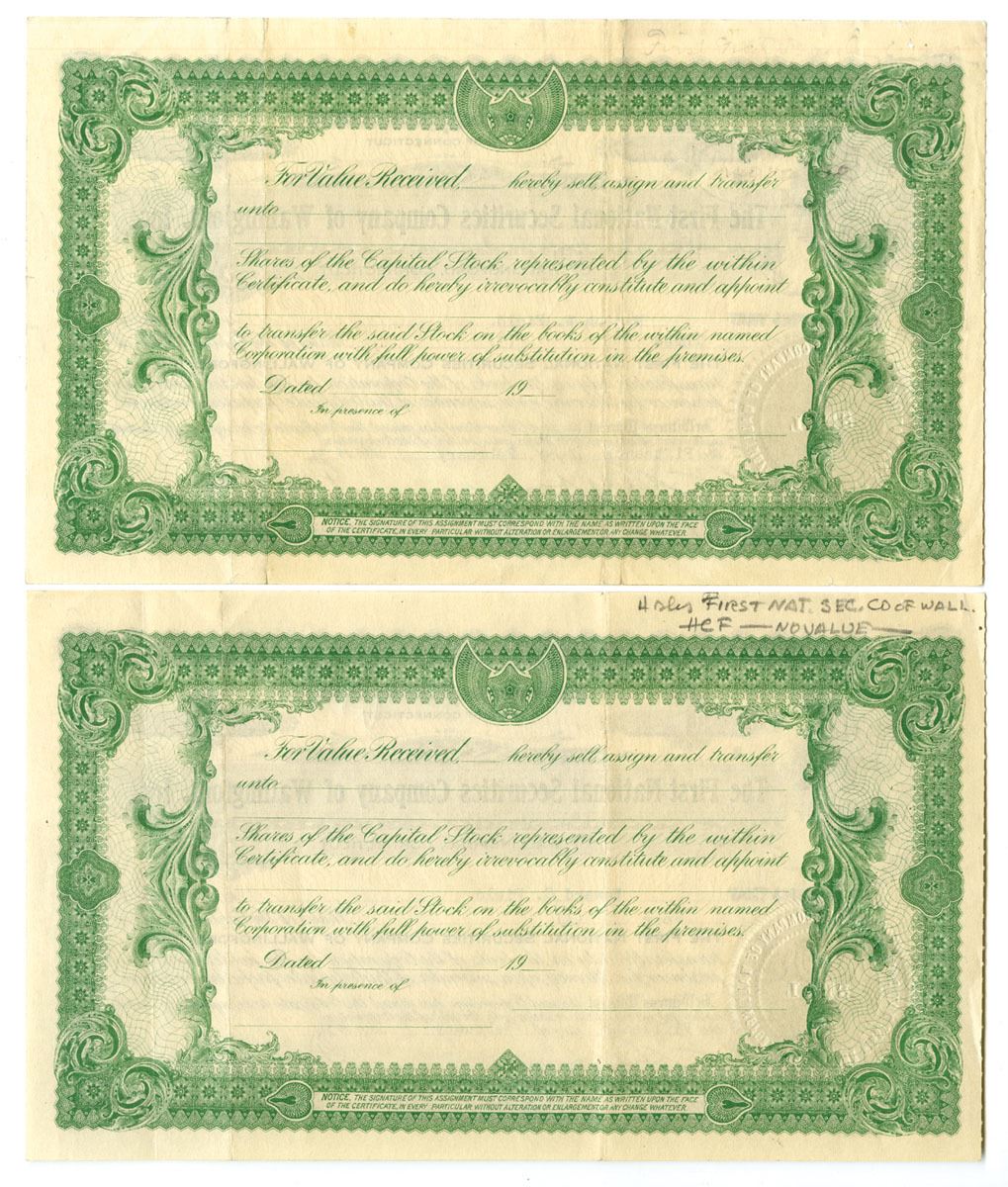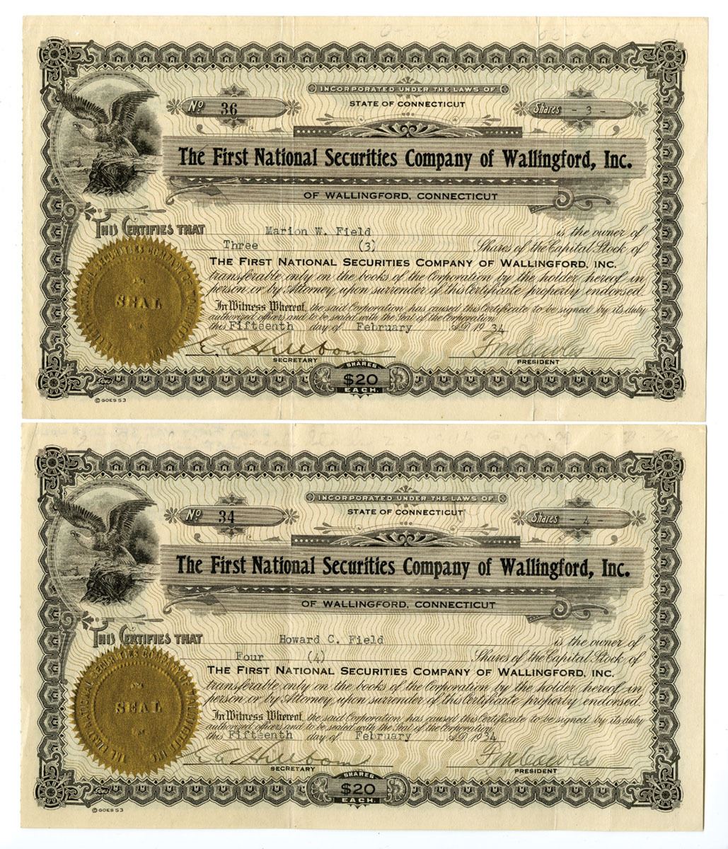 Connecticut...... 1934. Lot of 2 certificates: 4 Shares I/U Capital Stock Certificate, S/N 34; and 3 Shares I/U Capital Stock Certificate, S/N 36. Both the same, Black text with black border, Eagle on rock at top left corner. VF condition with some slight splitting along vertical fold lines. (John E. Herzog Collection) (2)