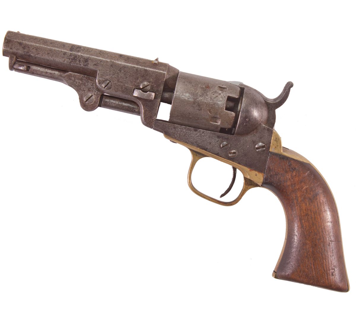 This is an 1849 Colt Pocket Model Revolver Second Type. All serial numbers match, action still works with the cylinder a little loose. There is some pitting on the frame but brass grip and trigger guard areas are in bright shape with very light pitting. The wood grips are also in very nice condition Serial number 178421 was manufactured in 1860. Cylinder is engraved with picture of a coach. This is a nice firearm and is in very nice condition considering that it’s over 150 years old. As to whether it still works, we are selling it "AS IS" and recommend that you have a reputable gunsmith determine the feasibility of that action and take no responsibility for the possible consequences.