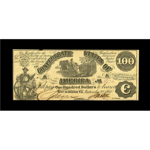 <B>CT13/55 Counterfeit $100 1861.</B></I> This skillful lithographed counterfeit has plate letter MA and hand-written serial numbers and signatures. It is listed as a Rarity 8 in <I>Counterfeit Currency of the Confederate States of America</B></I> by George R. Tremmel. This <B>Crisp Uncirculated</B></I> counterfeit exhibits a tiny bit of ink erosion and some pinholes.