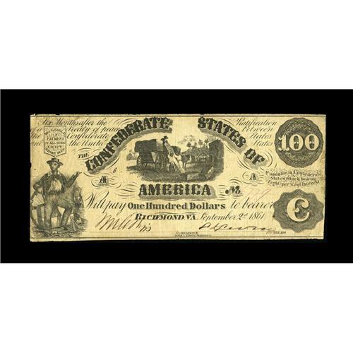 <B>CT13/57A Counterfeit $100 1861.</B></I> This deceptive lithographed counterfeit has plate letter A8, hand-written serial numbers and signatures. It is listed as a Rarity 8 in the Tremmel tome. A couple of half inch edge tears are also noticed. <B>Fine.</B></I>