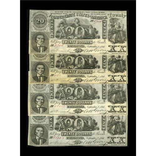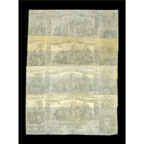 <B>CT20/141 Counterfeit $20 1861 Four Examples.</B></I> These First Series lithograph counterfeits have plate number 6, printed signatures, and written serial numbers. These are rated as a Rarity 6 by Tremmel. Another characteristic of counterfeits for this design is the fact that on genuine notes, <I>Cupid</B></I> and <I>Hope</B></I> have slight smiles, while on counterfeits they exhibit a hint of sadness. This is an important diagnostic when spotting counterfeits within groupings of Criswell T20. <B>About Uncirculated or Better.</B></I>