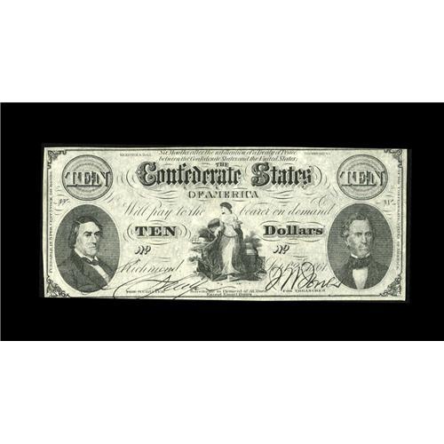 <B>CT25/168 Counterfeit $10 1861.</B></I> This is a dangerous lithographed counterfeit that exhibits embossing. The serial numbers have not been filled in. It is listed as a Rarity 7, 26 - 50 known, in the Tremmel tome. <B>Very Fine.</B></I>