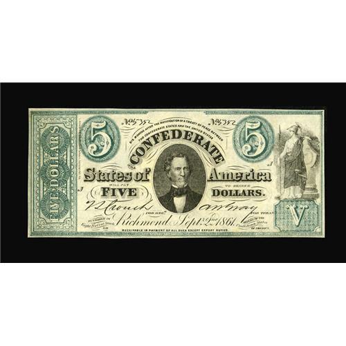 <B>CT33 $5 1861.</B></I> This "Plate J" counterfeit is gorgeous and boasts perfect paper quality. The signatures are printed, and the serial numbers were hand written. <B>Choice Crisp Uncirculated.</B></I><BR><BR><b>Shipping:</b> Coins & Currency (<a target="_blank" href="http://www.heritageauctions.com/common/shipping.php">view shipping information</a>)