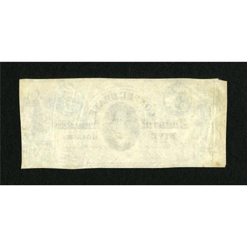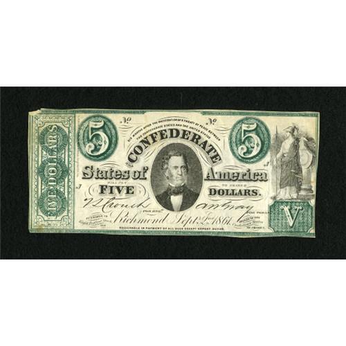 <B>CT33 $5 1861.</B></I><BR> This scarce <B>Very Fine </B></I>note has original paper surfaces that include a small tear in the upper left corner and an approximate half inch left edge tear.<BR><BR><b>Shipping:</b> Coins & Currency (<a target="_blank" href="http://www.heritageauctions.com/common/shipping.php">view shipping information</a>)