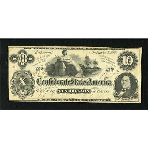 <B>CT46/344A $10 1862.</B></I> This problem free counterfeit exhibits sound edges and paper for the grade. It is a faithful reproduction of a genuine note. It has plate letter K, written signatures, written serial numbers, and "of" is present besides the first "A" of "America." This counterfeit is listed as a Rarity 8, 16-25 notes estimated to exist, in the Tremmel tome. <B>Very Fine.</B></I><BR><BR><b>Shipping:</b> Coins & Currency (<a target="_blank" href="http://www.heritageauctions.com/common/shipping.php">view shipping information</a>)