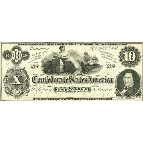 <B>CT46/344A Counterfeit $10 1862.</B></I> Problem-free is this counterfeit that is a faithful reproduction of a genuine note. <B>Very Fine+.</B></I>