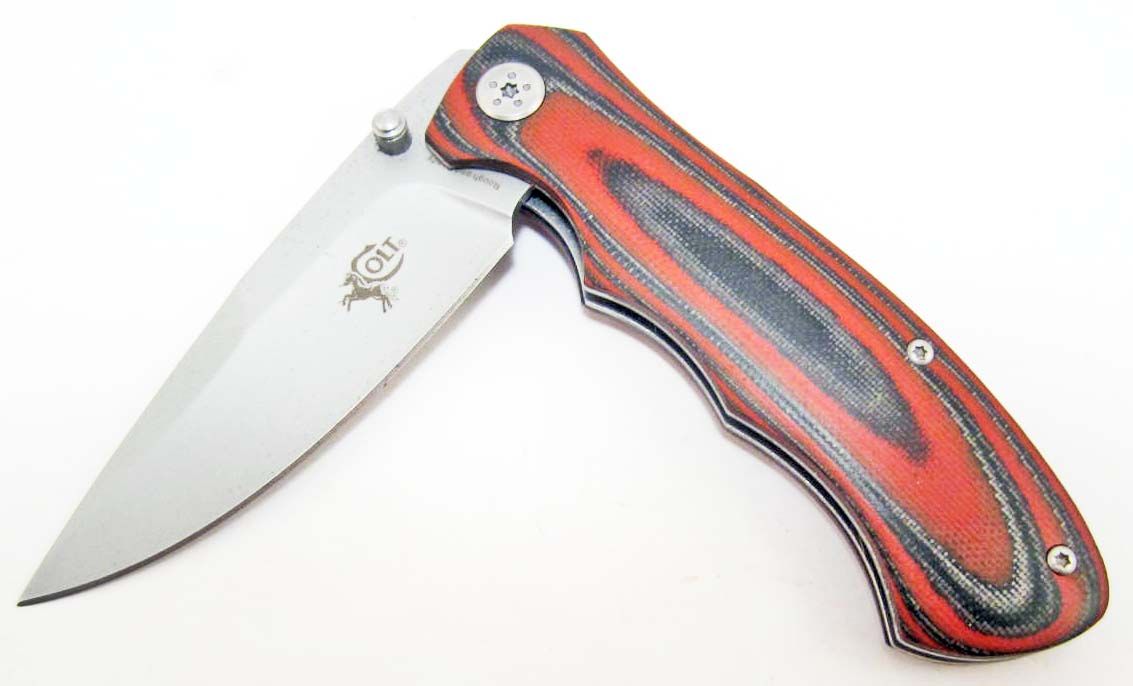 4 1/2" closed. 3 1/2" blade with thumb stud. Stainless pocket clip. Blood Stripe Series Knives have stainless blade and red and black striped micarta handles.