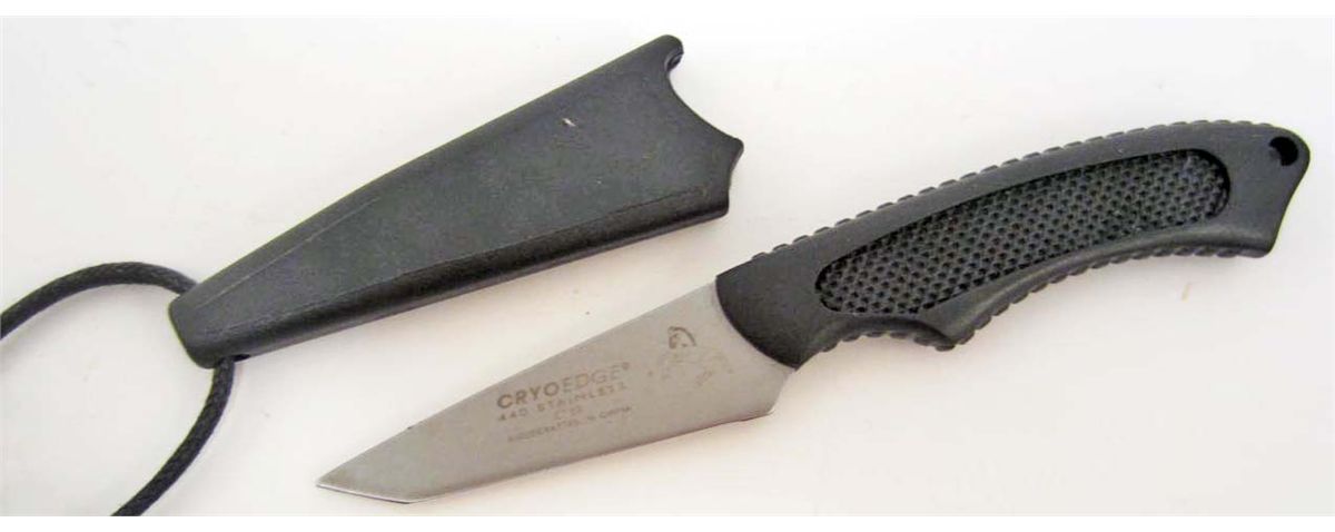 5 1/8" overall. 2 5/16" 440 stainless tanto blade with bead blast finish and CRYOEDGE. Black textured ABS handle with lanyard hole. Black ABS belt loop clip sheath with a magnetic locking system. Sheath can be worn around the neck or shoulder. Fred Carter design.