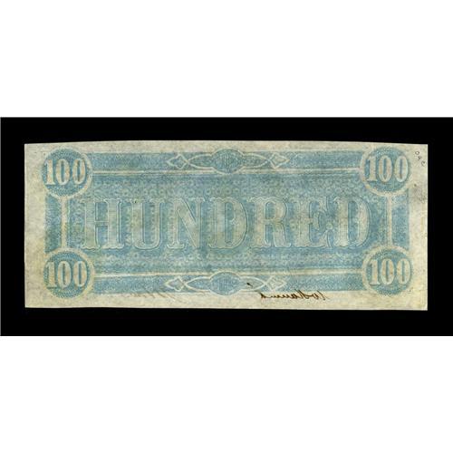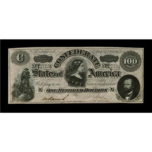 <B>CT65/491 "Havana Counterfeit" $100 1864.</B></I> Here is a nice example of this famous counterfeit that has plate letter D, written signatures, machine printed serial numbers, no space between standing soldier's body and elbow, smaller dimensions than a genuine note, and the back a lighter shade of blue than for a genuine note. This counterfeit is estimated as a Rarity 8, see <I>Counterfeit Currency of the Confederate States of America,</B></I> by George R. Tremmel. These counterfeits were accepted throughout the Confederacy due to their excellent lithography that paralleled if not surpassed the genuine notes. These "Havana" counterfeits were originally listed as genuine in the seminal Bradbeer tome of 1915. Criswell reports that the notes were produced in Havana and smuggled into Mobile. This lovely example exhibits embossing, ample margins, and a couple of pinholes. This is the most popular Confederate counterfeit. <B>Choice Crisp Uncirculated.</B></I><BR><I>From The William A. "Bill" Bond Collection</B></I><BR><BR><b>Shipping:</b> Coin/Currency (<a target="_blank" href="http://www.heritageauctions.com/common/shipping.php">view shipping information</a>)