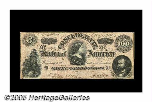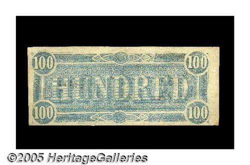 <B>CT65/491 "Havana Counterfeit" $100 1864.</B></I> Here is a nice example of this famous contemporary counterfeit that has plate letter D, written signatures, machine-printed serial numbers, no space between standing soldier's body and elbow, smaller dimensions than a genuine note, and the back is a lighter shade of blue than for a genuine note. This counterfeit is estimated as a Rarity 8, 16 - 25 notes estimated to exist, see <I>Counterfeit Currency of the Confederate States of America,</B></I> by George R. Tremmel. The lower left-hand corner tip has a small moisture spot, plus an edge nick. <B>Crisp Uncirculated.</B></I>