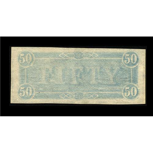 <B>CT66/501 Counterfeit $50 1864.</B></I> This is an example of the so-called $50 Havana counterfeit. Counterfeits of this number are from the 1st Series and have the ZA plate letters along with written signatures and machine printed serial numbers. There is also a flourish over "Con" in "Confederate." This $50 is full framed with sharp edges. A couple of pinholes are noticed. <B>Choice Crisp Uncirculated.</B></I>