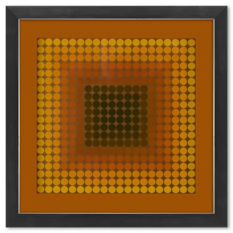 "CTA - 101 de la série CTA - 102" is a heliogravure print on paper, published in 1971, by Victor Vasarely (1908-1997). This piece comes custom framed, with a letter of authenticity and with a 1976 Vasarely paperback. Measures approx. 11.5" x 11.5" (frame), 9" x 9" (image).
