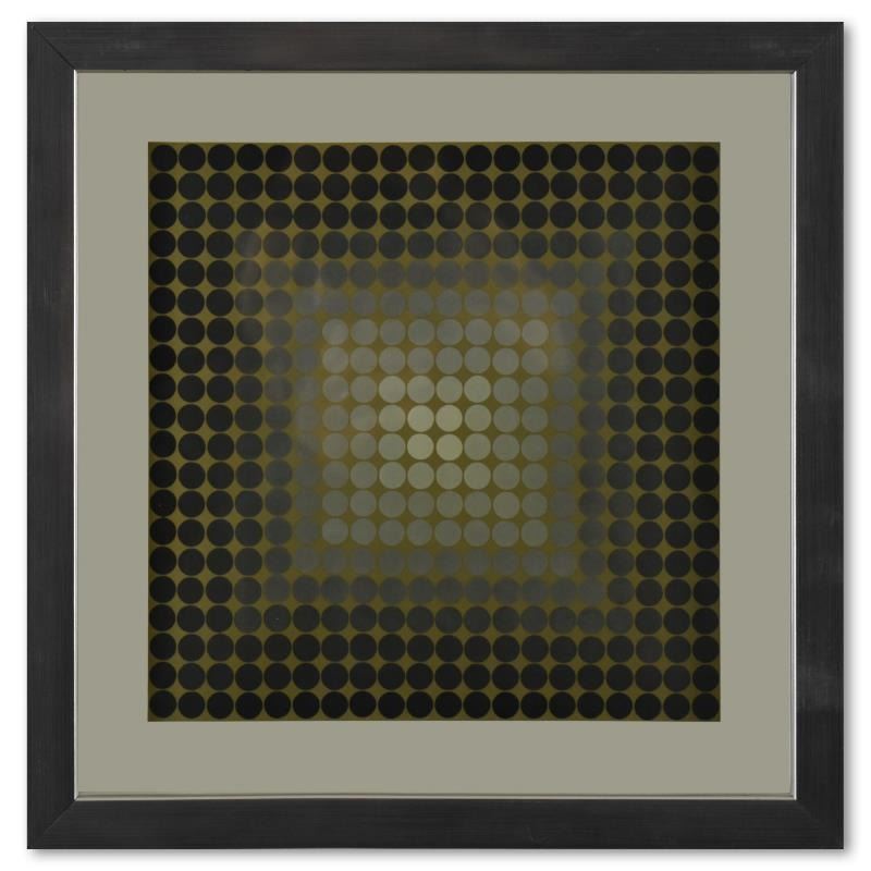 "CTA - 102 de la série CTA - 102" is a heliogravure print on paper, published in 1971, by Victor Vasarely (1908-1997). This piece comes custom framed, with a letter of authenticity and with a 1976 Vasarely paperback. Measures approx. 11.5" x 11.5" (frame), 9" x 9" (image).