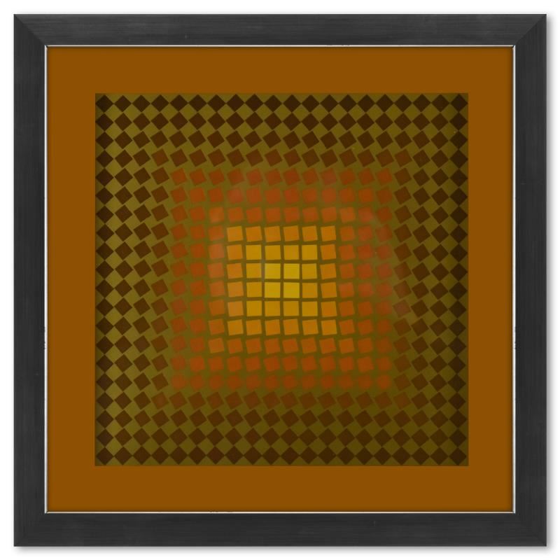 "CTA - 105 - OR de la série CTA - 102" is a heliogravure print on paper, published in 1971, by Victor Vasarely (1908-1997). This piece comes custom framed, with a letter of authenticity and with a 1976 Vasarely paperback. Measures approx. 11.5" x 11.5" (frame), 9" x 9" (image).