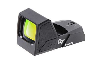 The CT RAD (Rapid Aiming Dot) Electronic Sight is a full-size Open Reflex Sight for full frame pistols. Featuring a red 5 MOA aiming dot, the CT RAD has a recessed and fully multi-coated lens with a large quick acquisition window. The CT RAD comes with an AUTO Shutoff Function that automatically shuts off after 8 consecutive hours of operation to conserve battery life and a manual ON/OFF Function that allows you to turn on or off the sight by using the side brightness buttons. The CT RAD is easily installed on an optics cut slide using the CT RAD footprint that is also compatible with the Docter footprint. Textured sides allow for a secure grip when racking the slide. The CT RAD has large brightness setting buttons for easy use even with gloves on. Made of 7075 Series Aerospace Aluminum, it is 30% stronger than most industry standard sights made with 6061 Series Aluminum. The entire CT RAD family has an Innovative top strap design that deflects force if the sight is dropped.