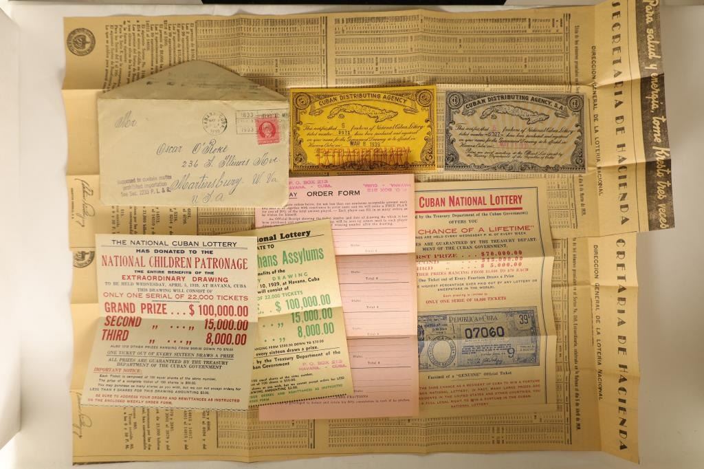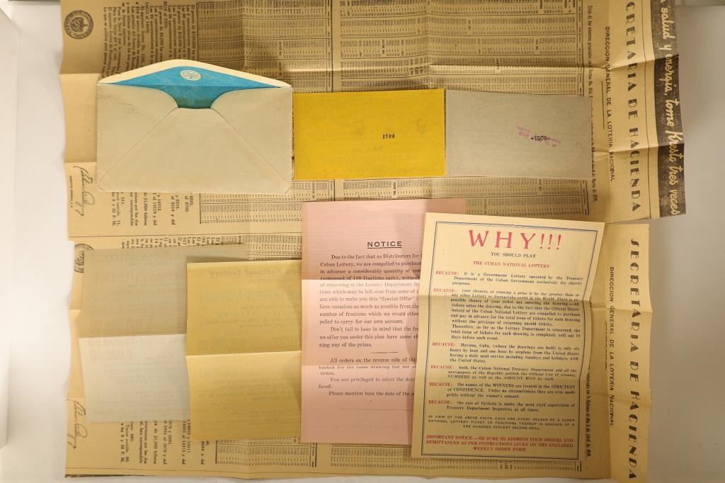 6 ADVERTISEMENTS AND 2 LOTTERY TICKETS THAT ARE CRISP. INCLUDES 1 ENVELOPE WITH CANCELLED STAMP FROM CUBA