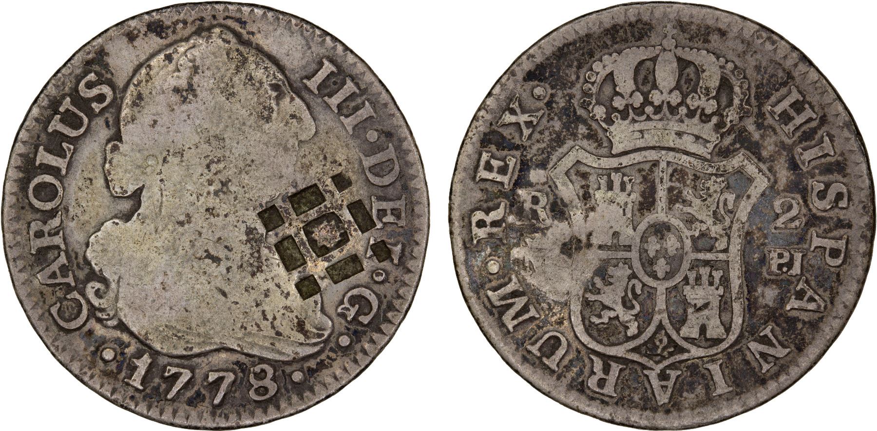 CUBA: Carlos III, 1759-1788, AR 2 reales, 1778-M, as KM-1.1, as Craig-38, lattice countermark on Madrid 2 reales (KM-412.1, assayer PJ), bold countermark, VF on VG host, ex Almer H. Orr III Collection.