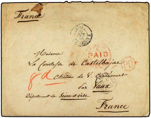 1856 HABANA a FRANCIA. Por el correo Británico, fechador circular pequeño HAVANA/PAID y tarifa manuscrita ´8d.´, fechador de tránsito de LONDRES y entrada en FRANCIA. Muy raro fechador de portes pagados de La Habana.