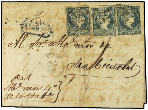 4(3) 1857 (Marzo) HABANA a S. CRISTOBAL. 1/2 real verde (3). Carta CERTIFICADA, marca CERTIF. en rojo y "recibi" manuscrito del destinatario en el interior, al dorso fechador de llegada a S. CRISTOBAL / ISLA DE CUBA. MAGNIFICO Y MUY RARO. Cert. GRAUS.