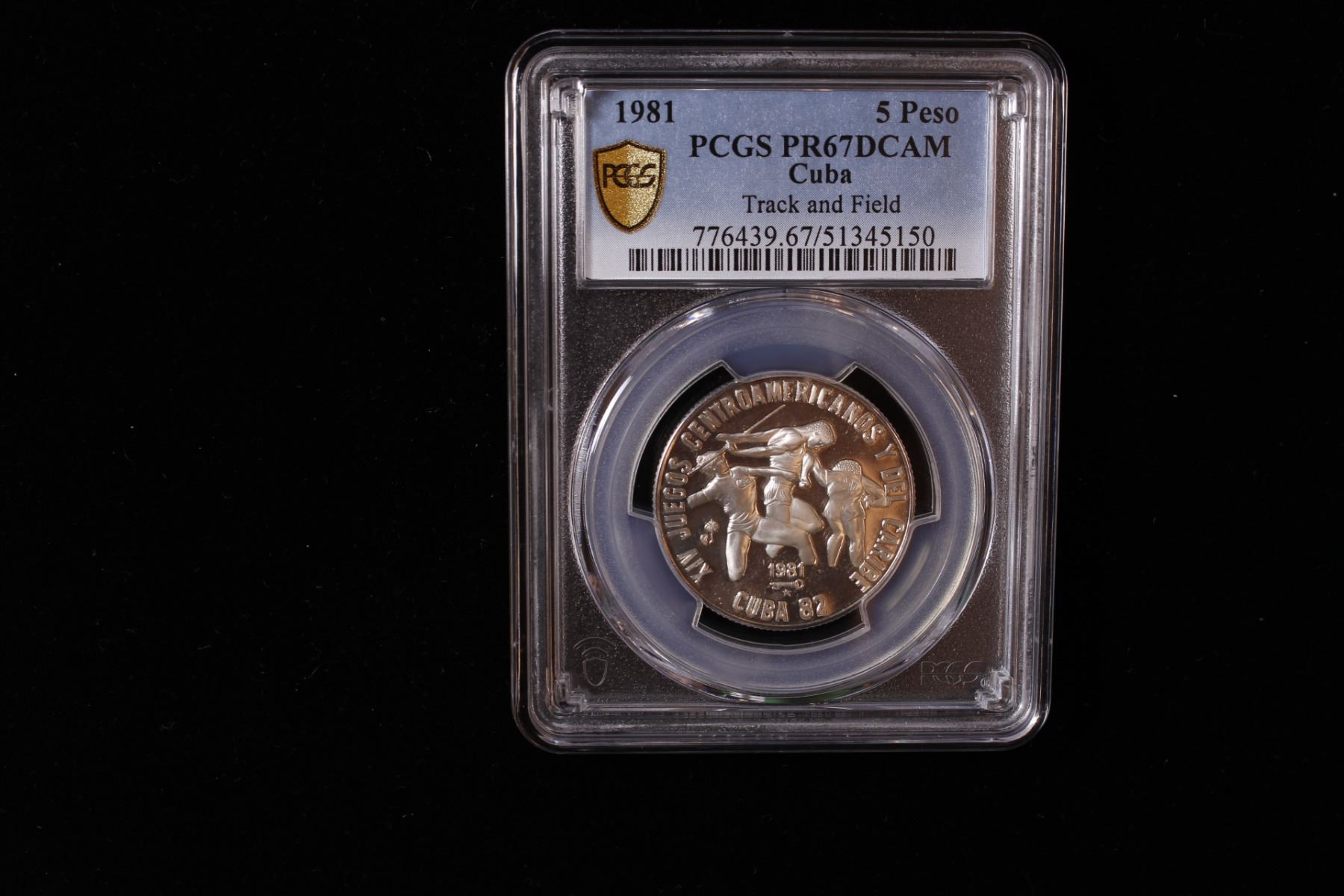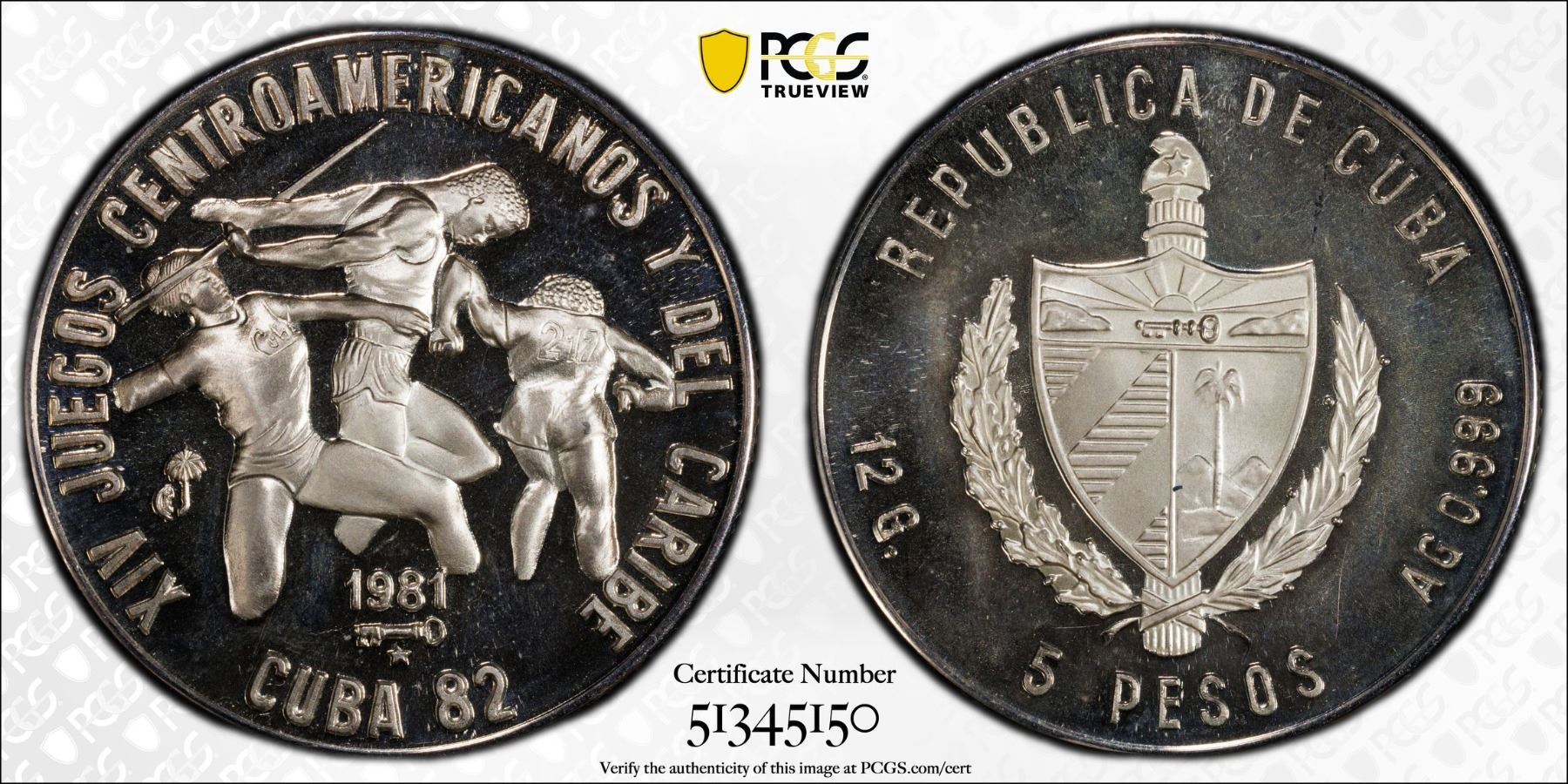 CUBA: Republic, AR 5 pesos, 1981, KM-80, Central American and Caribbean Games -Track and Field, PCGS graded Proof 67 DCAM.