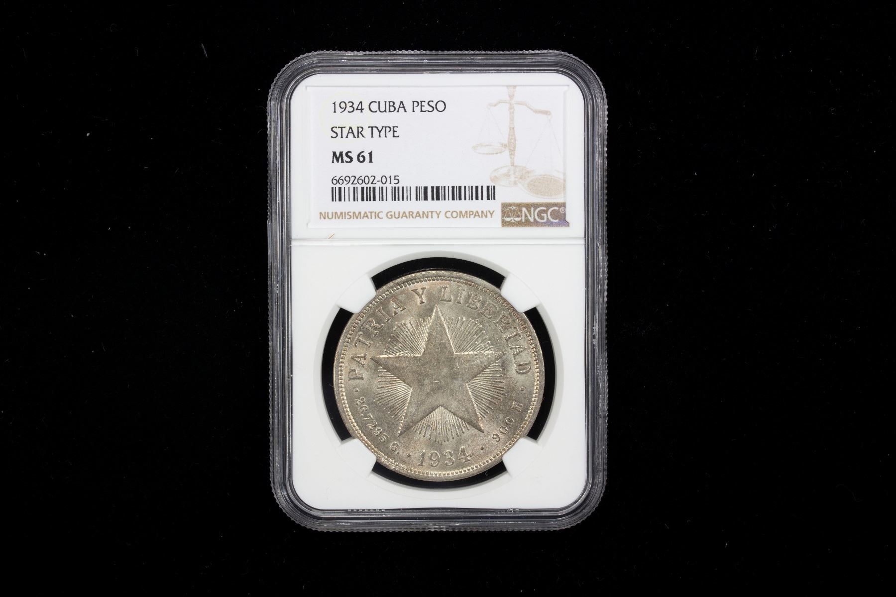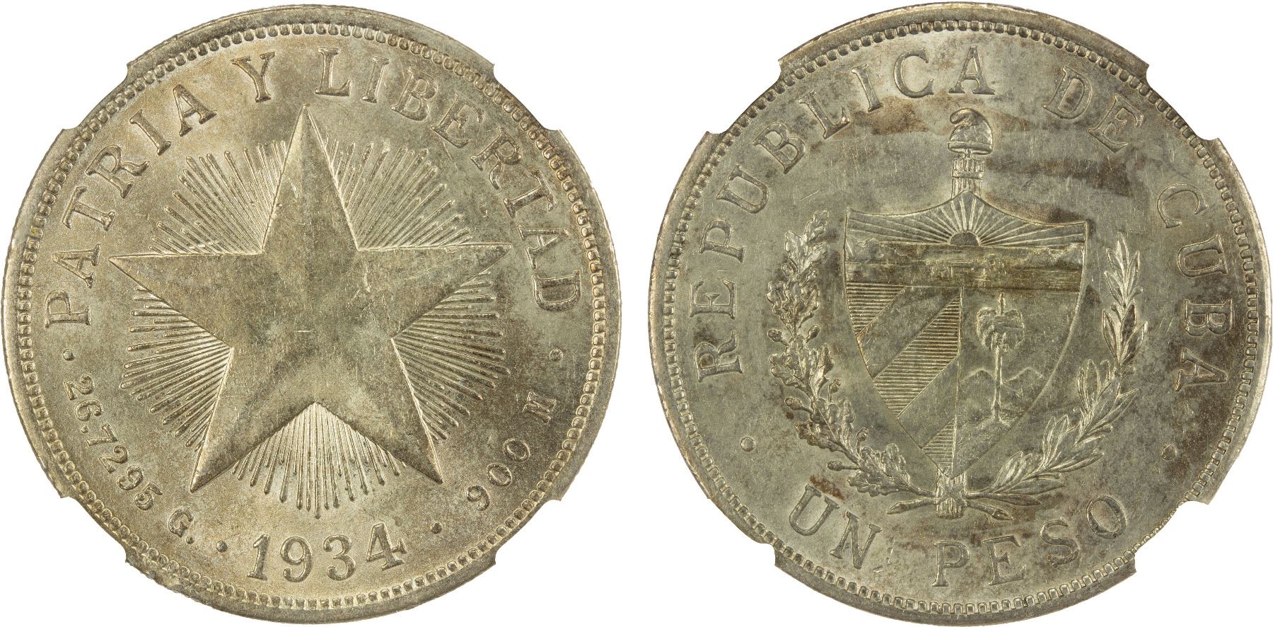 CUBA: Republic, AR peso, 1932, KM-15.2, 'Star' peso type, struck at the United States Mint, Philadelphia, a pleasant mint state example, NGC graded MS61.