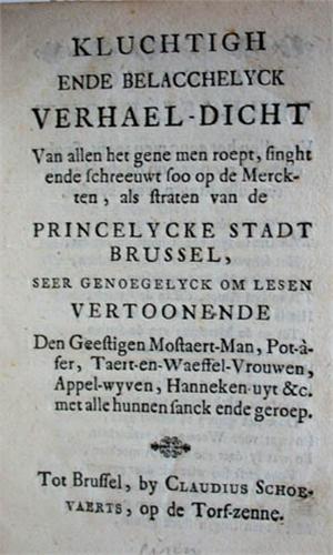 Zeldzaam volksboekje vertoonende "den Geestigen Mostaert-Man, Pot-à-fer, Taert-en-Waeffel-Vrouwen, Appel-wyven, Hanneken-uyt &c. met alle hunnen sanck ende geroep". Het acrosticon op de laatste pagina levert de naam van de overigens geheel onbekende auteur die hierbij onder versvorm een verzameling biedt van de aanprijzingen der Brusselse marktkramers. De voorliggende ongedateerde uitgave betreft waarschijnlijk de aan Ermens toegeschreven roofdruk van dit oorspronkelijk in 1708 door Schoevaerts gedrukt werkje.