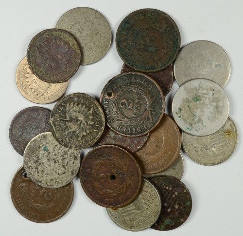 CULL LOT 9 SHIELD NICKELS, 5 2 CENT, 5 COPPER NICKEL CENTS MOST WITH DATES