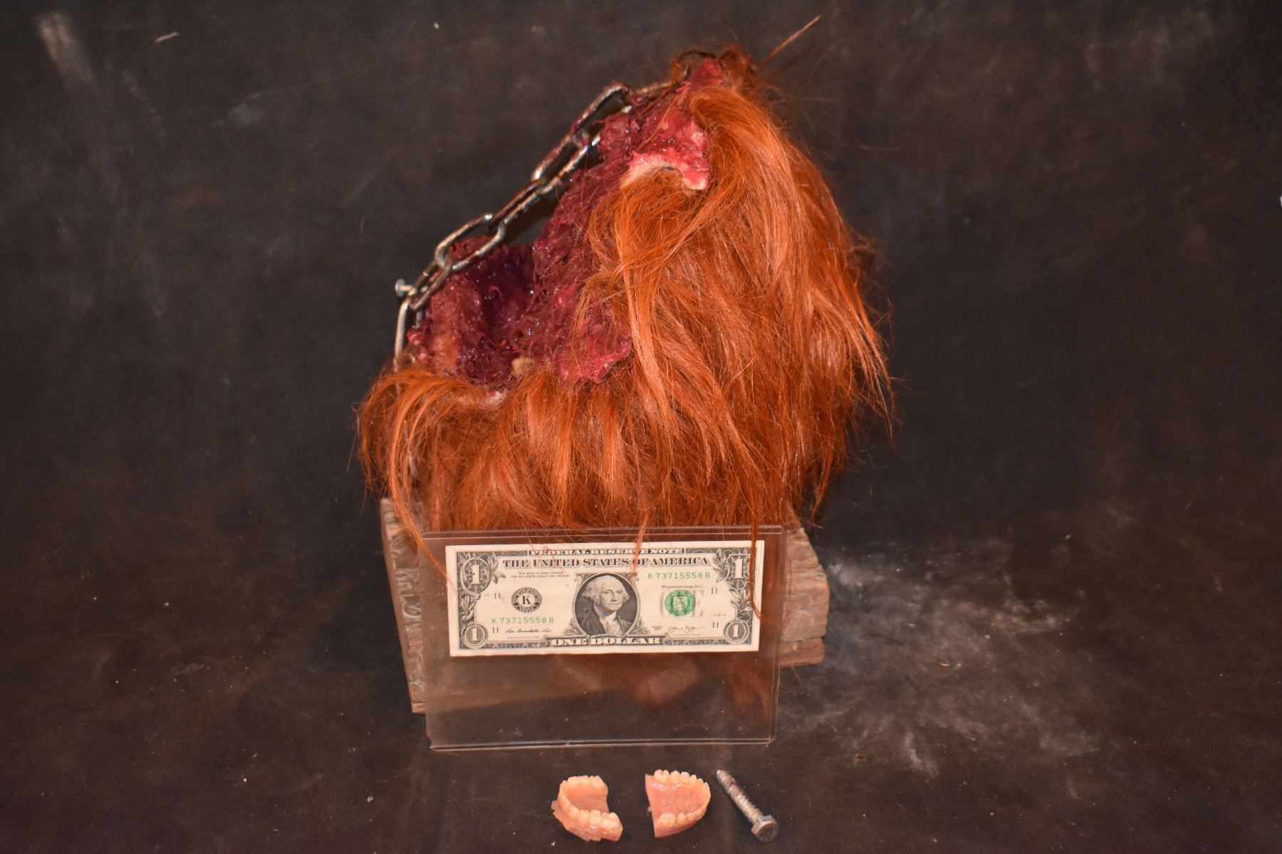 The Animatronics have been removed so it sits a little different than on screen, but all you see on screen is here! The loose bolt could not be used but it is included here. The teeth were part of the Animatronics, but a set is included if you wish to add.