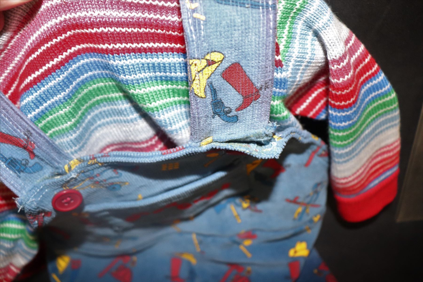 The final use of the pants was on the cut hair Chucky death scene shown in this clip. You can clearly see the transition from the other wardrobe with hats on top, to this wardrobe at .33 seconds in. It is this pants seen from that point on. [the shirt was destroyed]