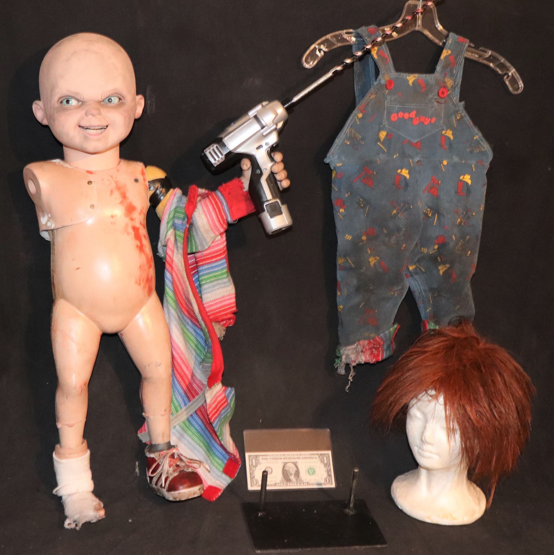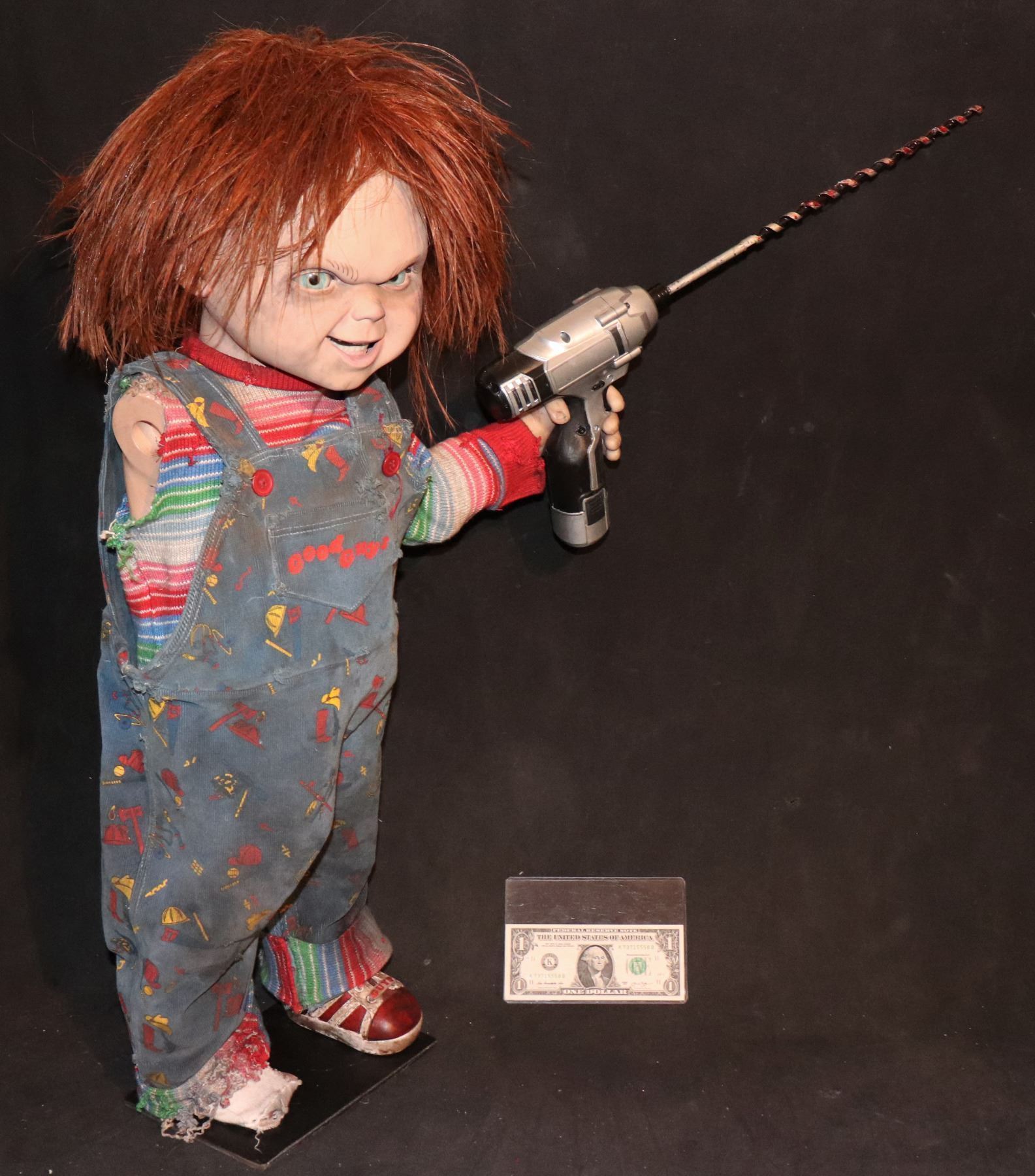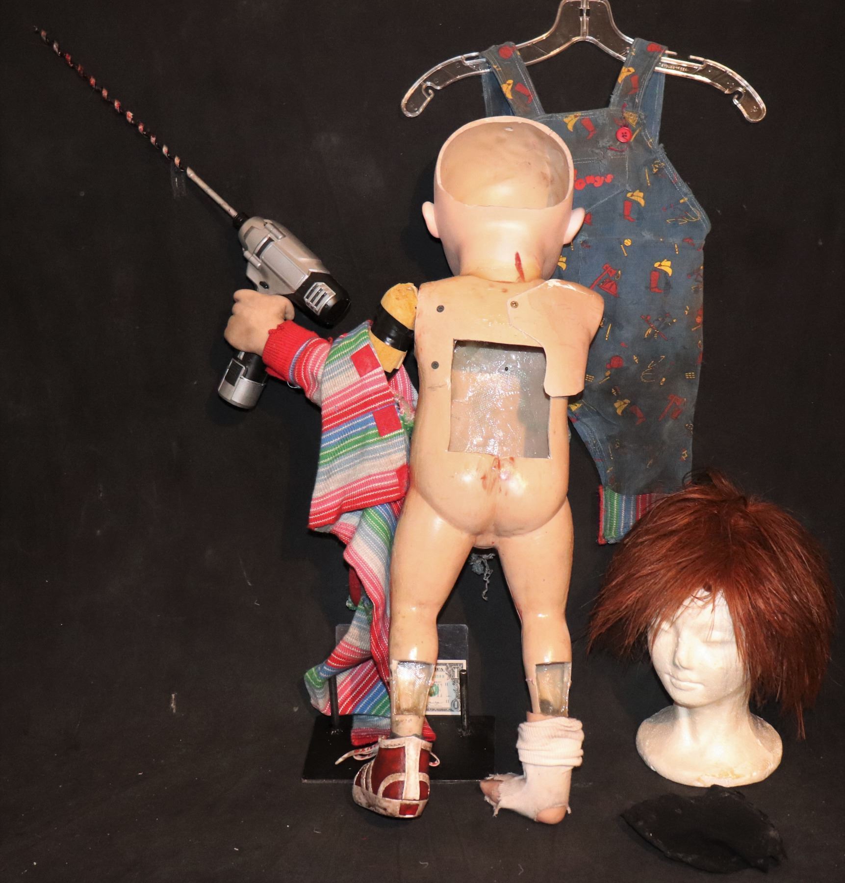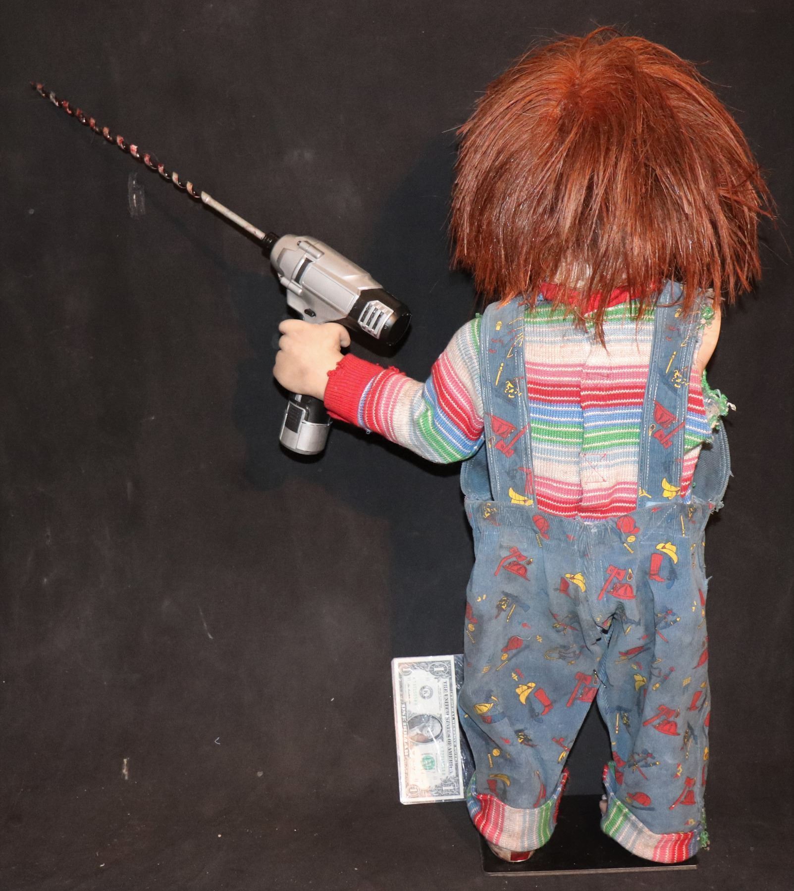 This is the HERO puppet wearing all of the SCREEN MATCHED distressed wardrobe and wig, and holding the "working Hero drill", still with blood and hair encrusted all over it!