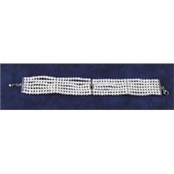 Lot 137 CULTURED PEARL AND DIAMOND BRACELET Very elegant bracelet has 6 rows of 4mm cultured pearls which are bound by 3 decorative 14kt. white gold bands which are set with single-cut white diamonds. The bracelet is finished with a hook clasp and sweetheart charm. Size is 8 1/2” l. CONDITION: Very good to excellent. 5-70901