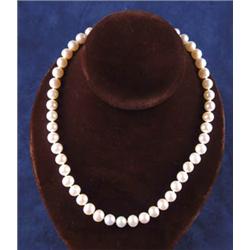 Lot 125 CULTURED PEARL NECKLACE Beautiful cultured pearl necklace is 18” l and features 9 1/2 - 10 mm pearls. The pearls have a wonderful luster with some flashes of pink. Necklace is finished with a 14kt. gold ball clasp set with a row of 3 small diamonds. CONDITION: Very good to excellent. 5-70900