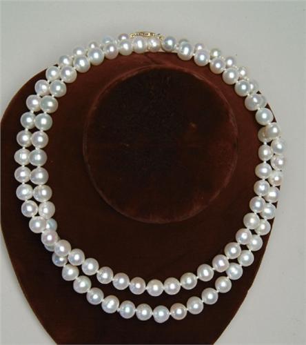 CULTURED PEARL NECKLACE. Very nice 36 in. long necklace is made up of 9-1/2 to 10mm cultured pearls. Necklace is finished with a 14kt yellow gold clasp. Pearls have some irregularities in nacar but overall have a beautiful silvery lustre. CONDITION: Very good to excellent. 5-61604