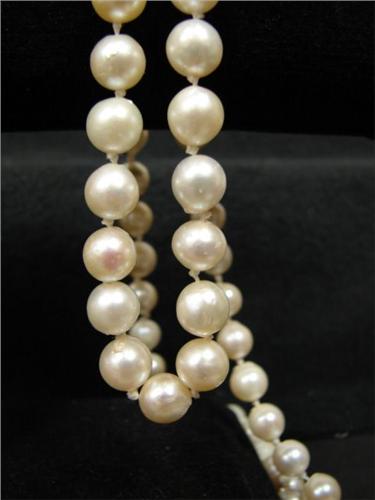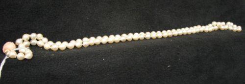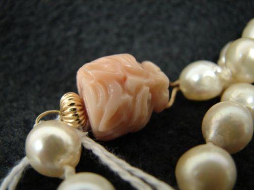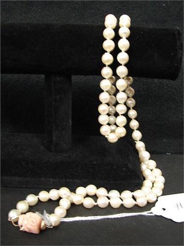 CULTURED PEARL NECKLACE. Has (8) 8 ½ mm pearls, good luster, with carved coral & 14KT yellow gold clasp. 36" L. 71.8 grams wt. Has CAGA appraisal.