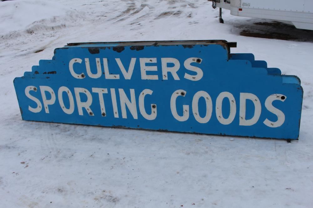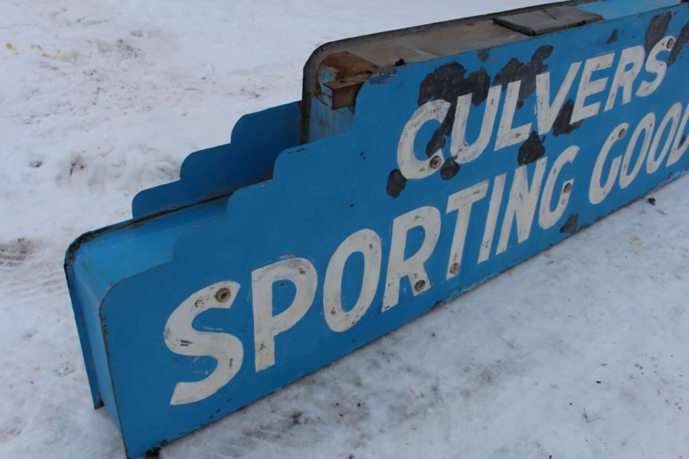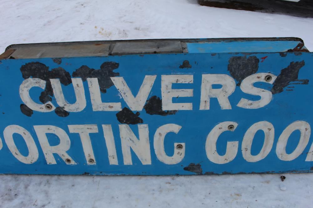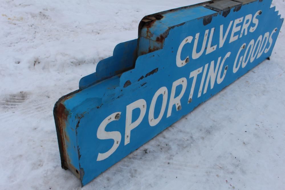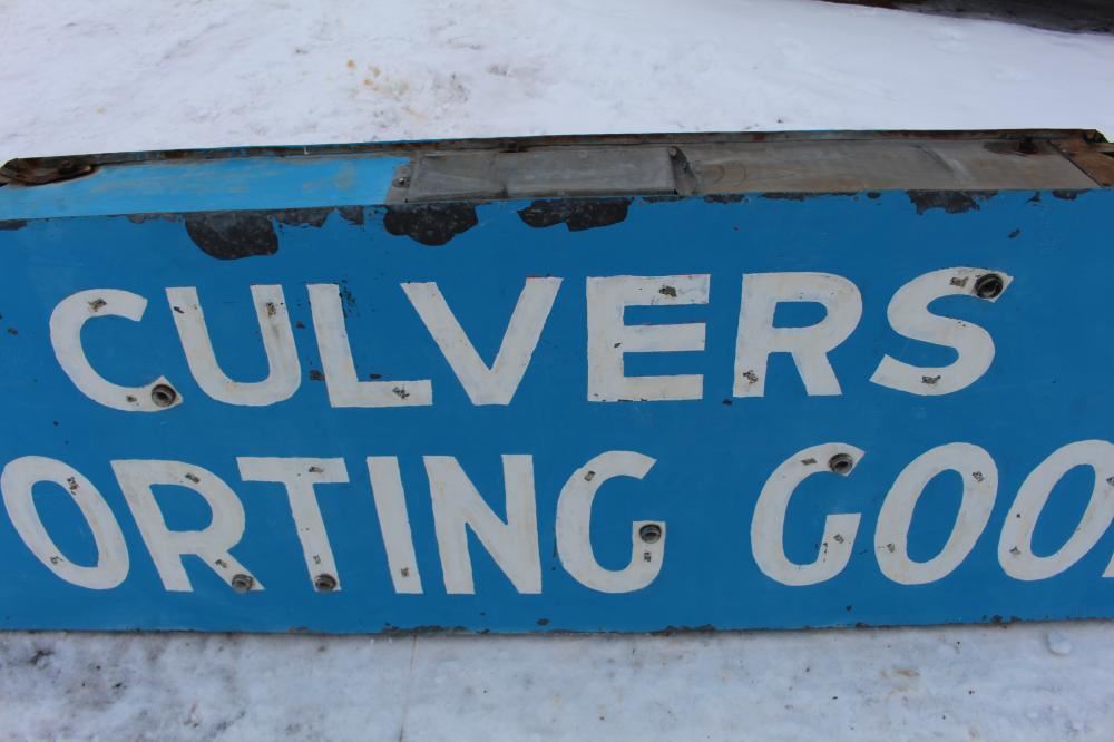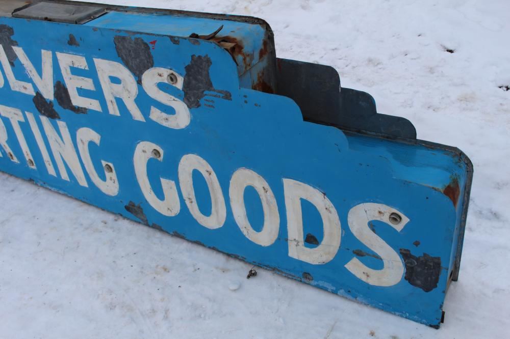 2 SIDED PAINTED TIN. PATINA, WEAR AND PEELING PAINT. 118 X 34 X 9. APPROXIMATE SHIPPING COST $100 TO $275. THIS ITEM IS GUARANTEED TO BE OLD.