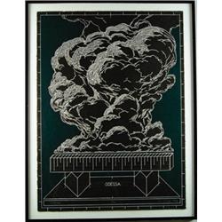 CUMMING (American, 20th Century) “ODESSA”. Limited edition print on paper. Titled in print and also signed in white pencil “Odessa 15/18 Cumming 1988”. Black and white with green background abstract scene shows abstract bomb blast over ruler type architectural form. Centered in a black wood frame with white background. SIZE: 47” x 34-1/2”. CONDITION: Very good. 9-98619