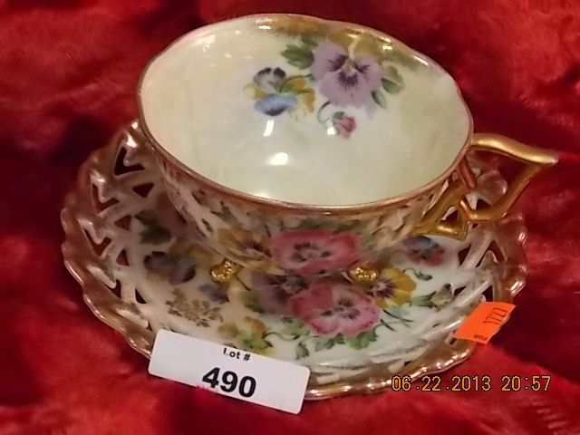 CUP (3 FEET ) AND LACE EDGE SAUCER - SMALL CHIP ON CUP - CASTLE CHINA HAND PAINTED