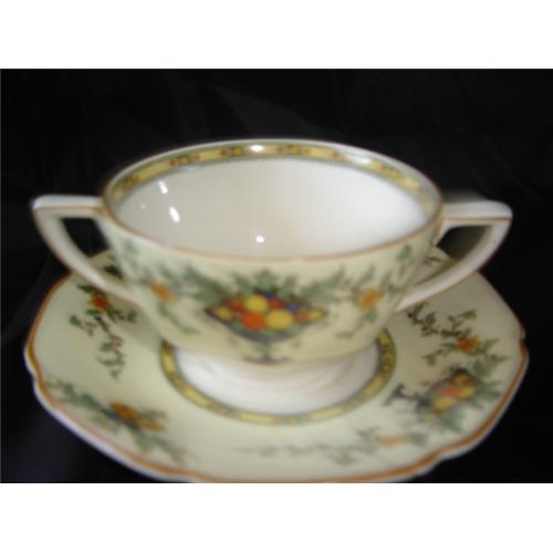 CROWN DUCAL MADE IN ENGLAND REGO M # 72944. BEAUITFUL LIGHT GREEN AND GOLD TRIM WITH A BOWL OF FRUIT DESIGN.VERY THIN PORCELAIN.