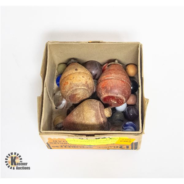 ANTIQUE MARBLES AND SPIN TOP LOT