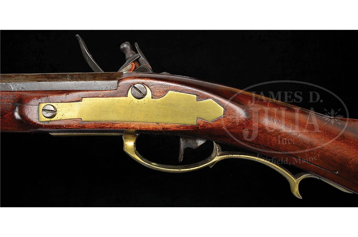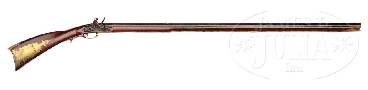 NSN. 43" long full oct .40 Cal unmarked smooth bbl unmarked. Flintlock is marked "MARTIN WARRANTED". Stock has profile of a Berks County/Reading area rifle. 4-pc brass patchbox is in the Pannabecker style. Brass sideplate identifies the rifle as having been made by a member of the Anstadt family of gunsmiths. The Anstadt's worked in Kutztown, PA circa 1825-1835. PROVENANCE: Frank Sujansky Collection. CONDITION: 27" of forend has been replaced. 3" x 1/4" wood repair under lock. Otherwise the gun is in nice condition. 4-49440 RG52
