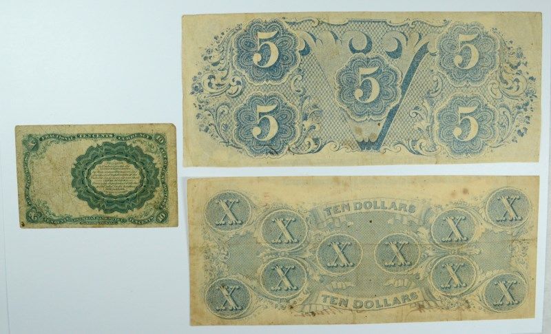 CURRENCY LOT: 1874 10 CENT FRACTIONAL, VG, $5.00 & $10.00 1873 CONFEDERATE