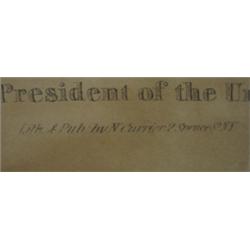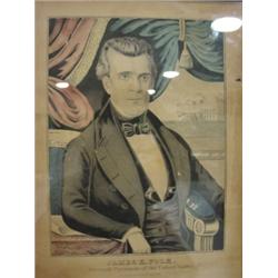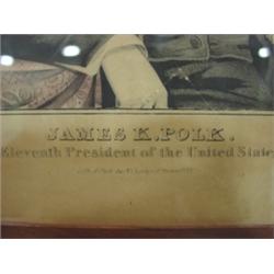 CURRIER COLOR LITHOGRAPH OF PRESIDENT JAMES POLK. Depicts a seated President Polk. Reads at bottom "James K. Polk-Eleventh President of the United States-Lith. & Pub. By N. Currier 2 Spruce St. NY". In cherry frame. Some fading and staining as well as one small tear on right border15.5" x 19.5" framed.