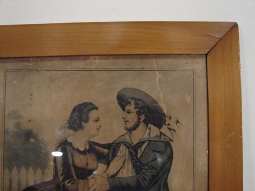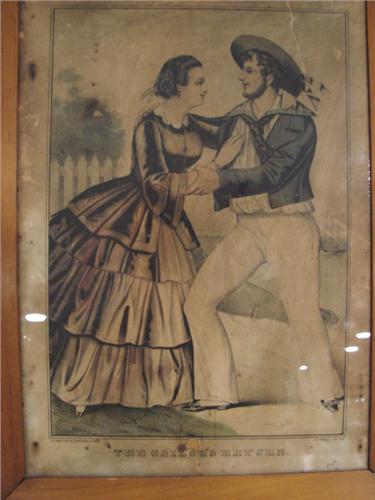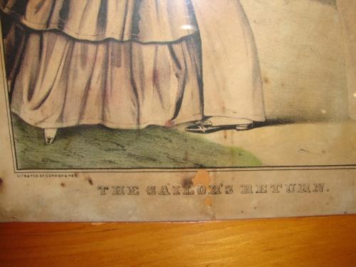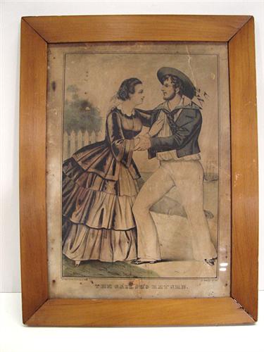 CURRIER & IVES 19TH CENTURY SAILOR PRINT. Titled "The Sailor's Return". Depicts a sailor returning home to his wife. In pine frame. Shows a large amount of wear and soiling with a small tear at top right corner. 12.5" x 16.5" framed.