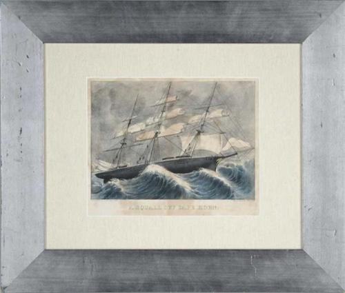 CURRIER & IVES (American, Publisher, 19th Century) “A SQUALL OFF CAPE HORN”. Listed as 5680 in Cunningham’s List. Scene shows three mast ship in snow squalls and rough seas. Housed in a silver flat modern frame with linen matte. SIGHT SIZE: 10-1/2” x 13”. IMAGE: 9” x 12-1/4”. CONDITION: All over toning, otherwise good. 9-27668